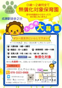成瀬駅前保育園だんでらいおんは、「無償化対象」の保育園になります。